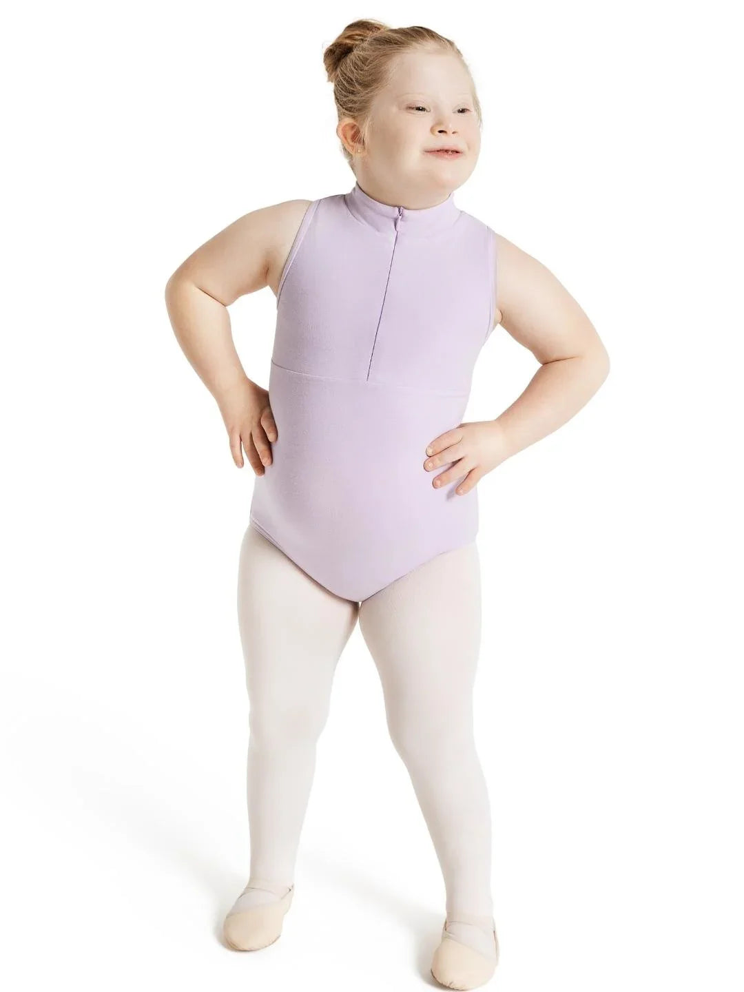 This sleek zip front leotard combines modern styling with practical functionality for young dancers. The convenient front zipper makes dressing quick and easy, while the smooth, stretchy fabric allows full range of motion during class and rehearsals. Designed with a secure fit that stays in place through turns and leaps, this leotard is perfect for dancers who want effortless, studio-ready style.