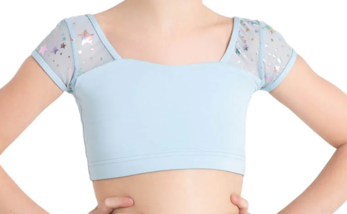 This stellar bra top features cosmic-inspired details with supportive construction for young dancers. The playful design adds a touch of sparkle while allowing full freedom of movement during class and rehearsals. Crafted with comfortable stretch fabric that stays securely in place through turns and leaps, this top is perfect for dancers who want whimsical, studio-ready style in contemporary and jazz classes.